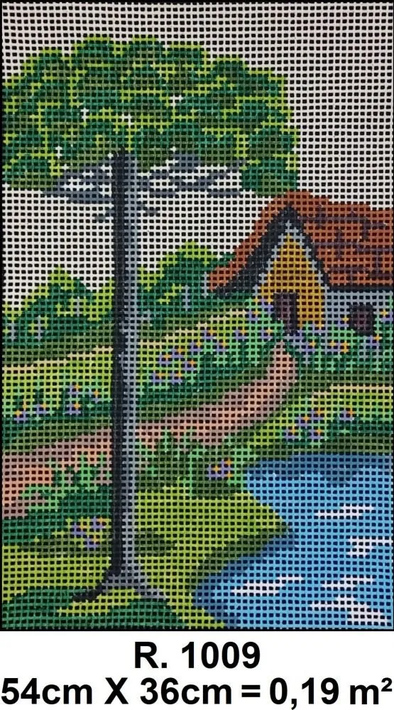 Tela talagarça pintada à mão, com pontos contados ímpares. Quadro, Paisagem.