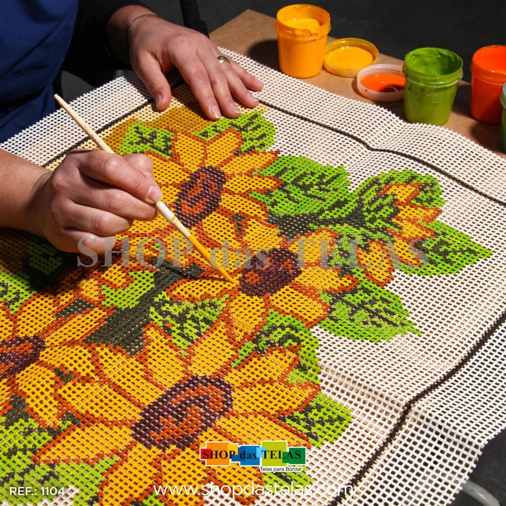 Tela talagarça pintada à mão, com pontos contados ímpares. Flores, Girassol.
