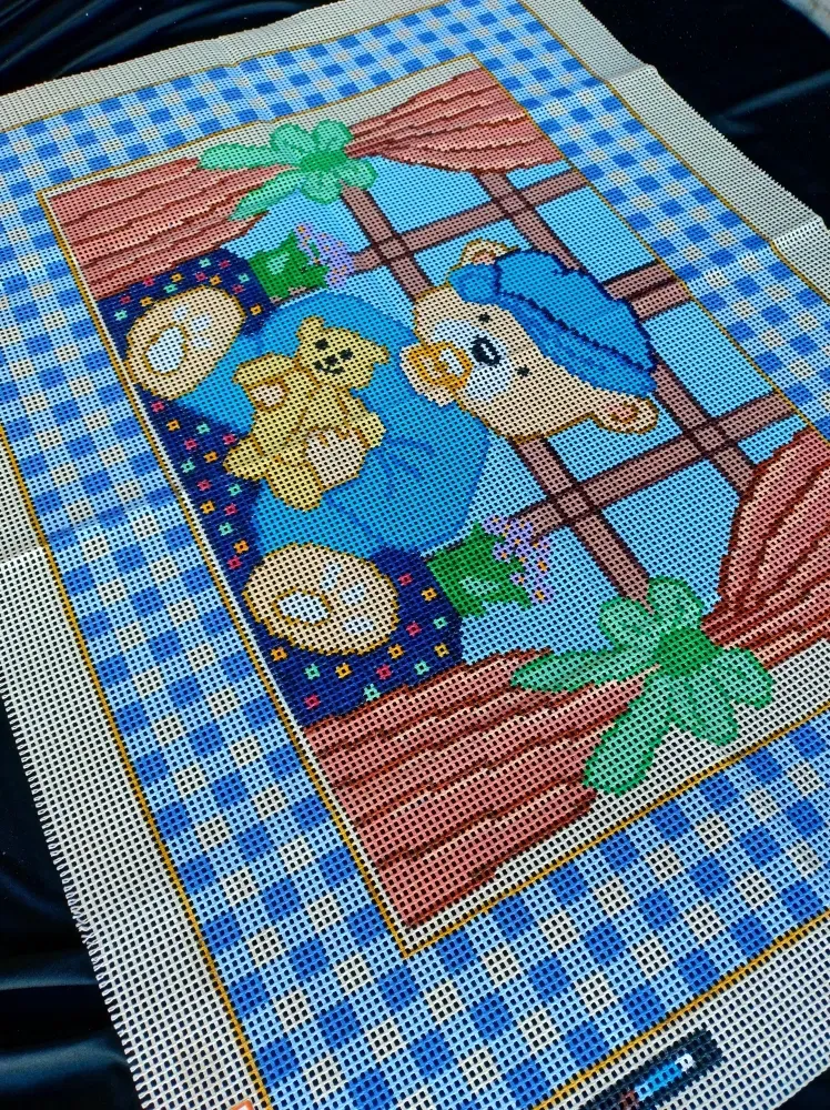 Tela talagarça pintada à mão, com pontos contados ímpares.