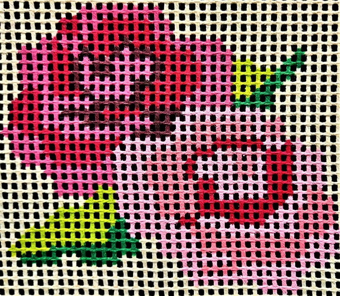 Tela talagarça pintada à mão, com pontos contados ímpares. Floral, Rosas.