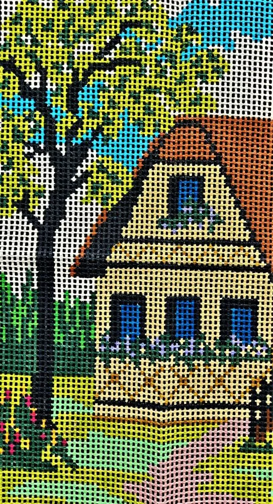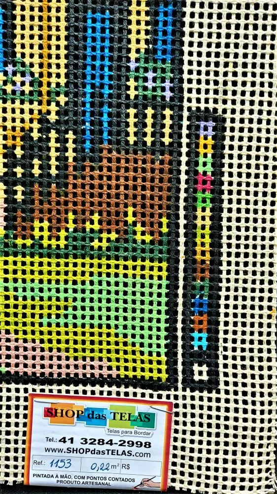 Tela talagarça pintada à mão, com pontos contados ímpares.
