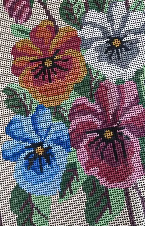 Tela talagarça pintada à mão, com pontos contados ímpares. Quadro, Flores, Amor-Perfeito