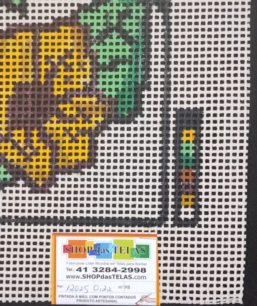 Tela talagarça pintada à mão, com pontos contados ímpares.