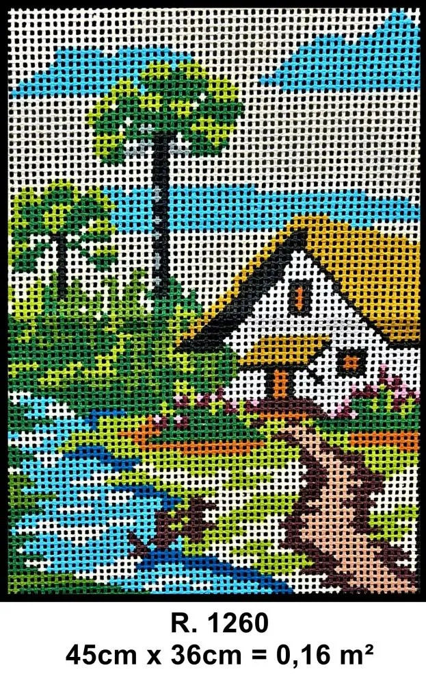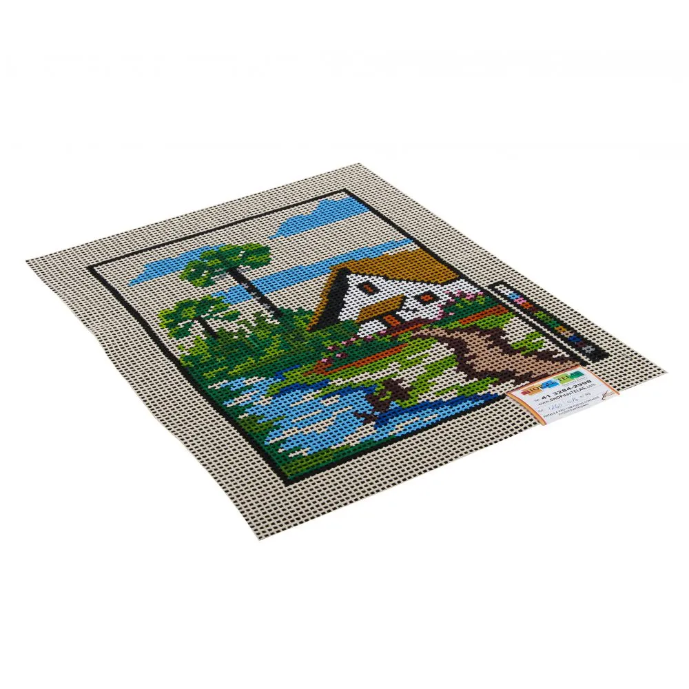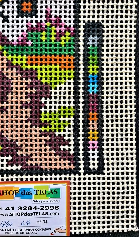 Tela talagarça pintada à mão, com pontos contados ímpares.