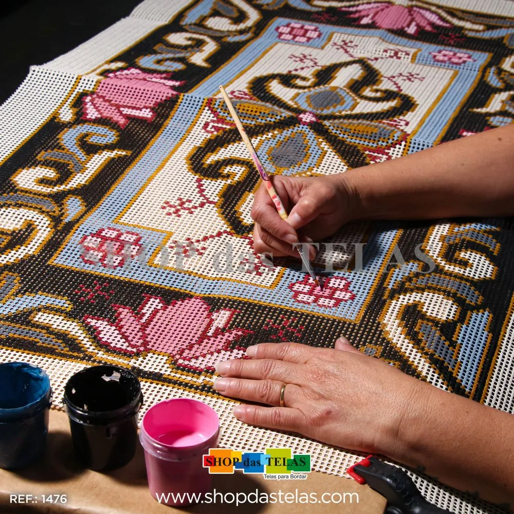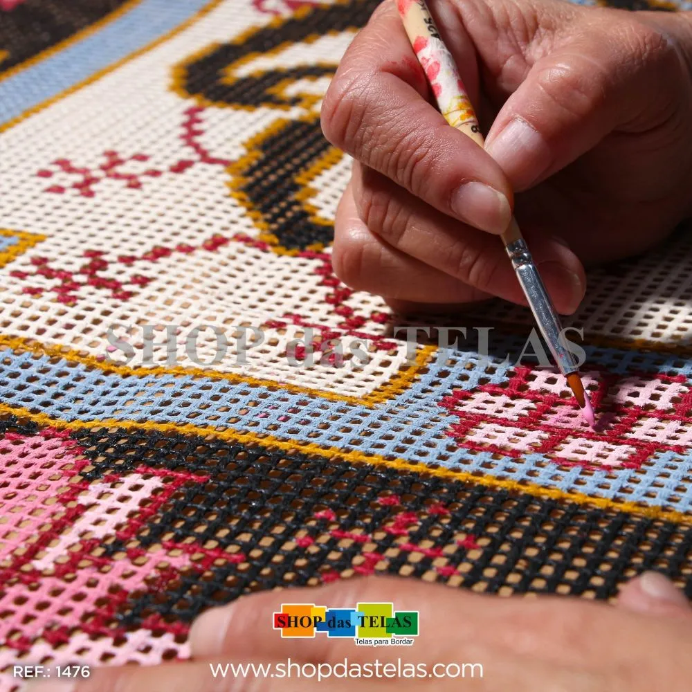 Tela talagarça pintada à mão, com pontos contados ímpares.
