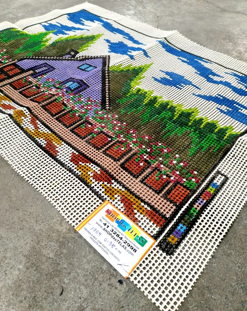 Tela talagarça pintada à mão, com pontos contados ímpares.