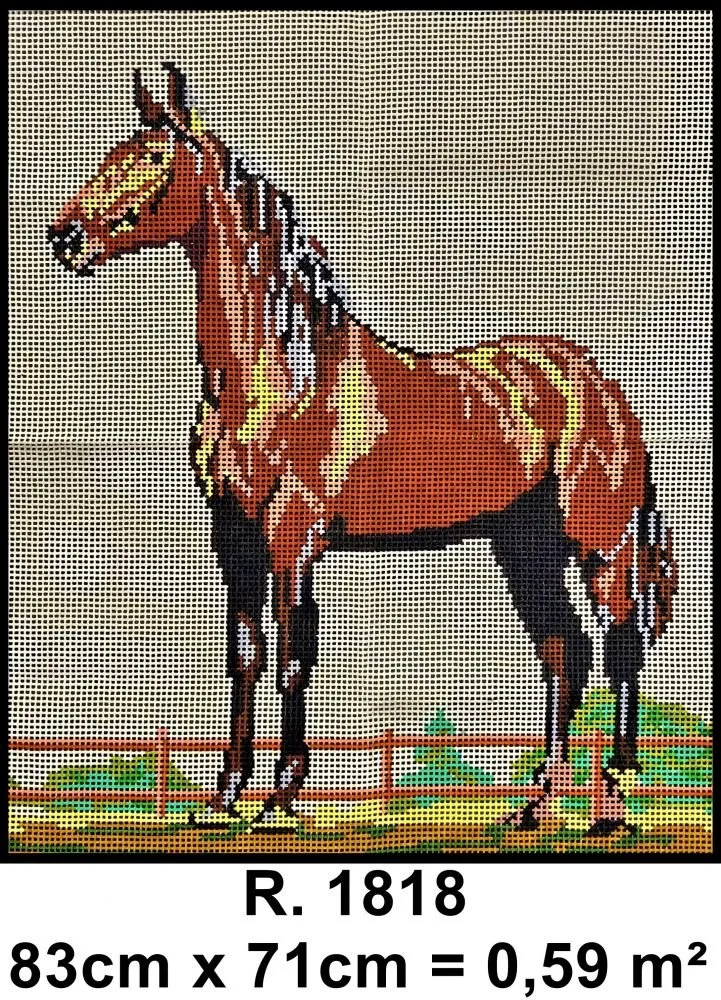 Tela talagarça pintada à mão, com pontos contados ímpares. Quadro, Animais, Cavalo, Alazão Colorado.