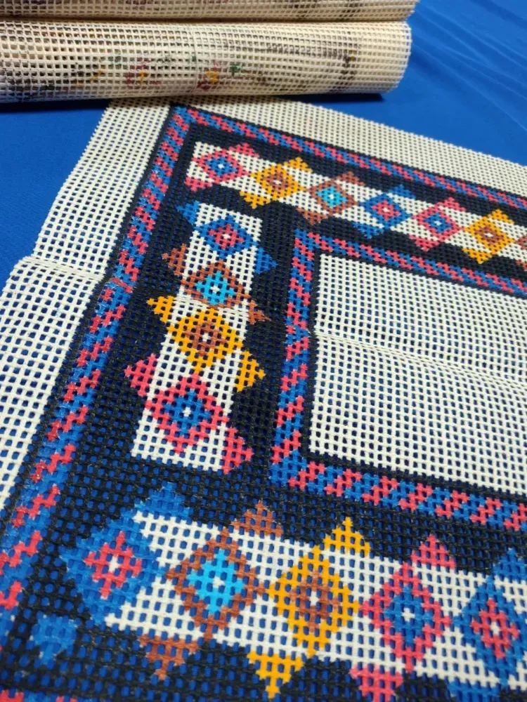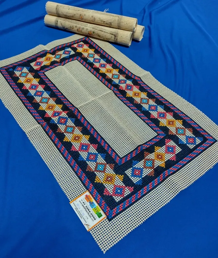 Tela talagarça pintada à mão, com pontos contados ímpares.