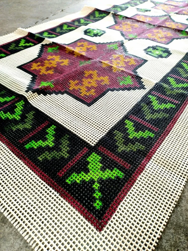 Tela talagarça pintada à mão, com pontos contados pares. Tapete, Passadeira, Geométrico.