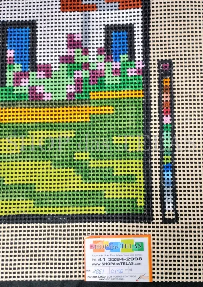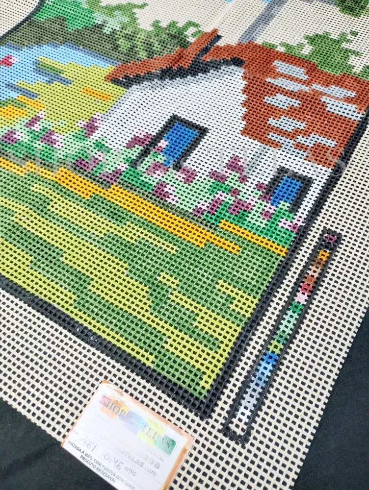 Tela talagarça pintada à mão, com pontos contados pares. Quadro, Paisagem.