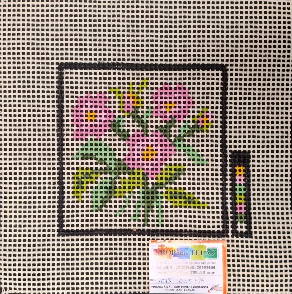 Tela talagarça pintada à mão, com pontos contados ímpares. Flores