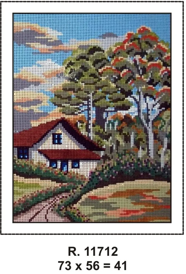 Tela talagarça pintada à mão, com pontos contados ímpares. Quadro, Paisagem.
