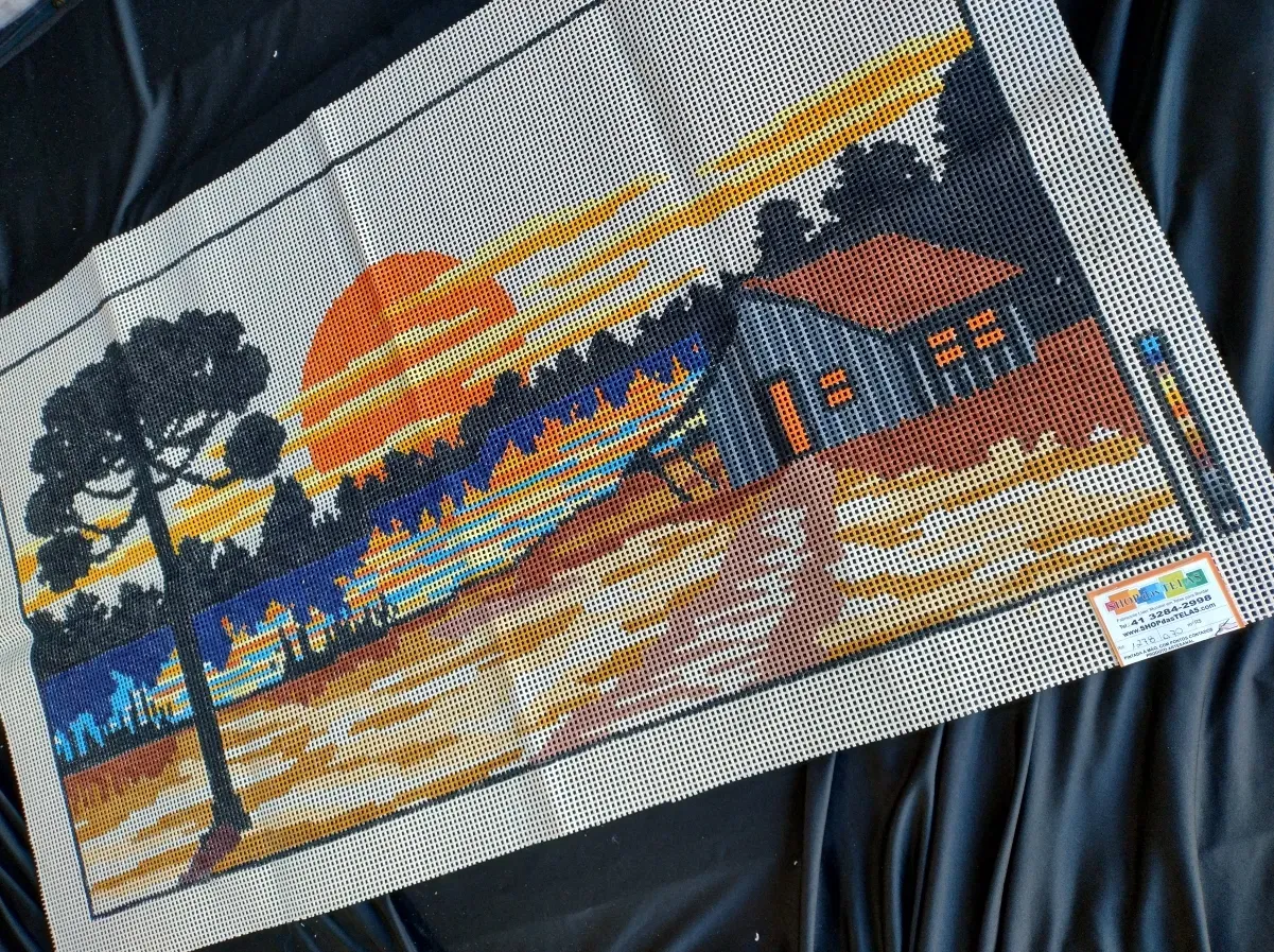 Tela talagarça pintada à mão, com pontos contados ímpares.