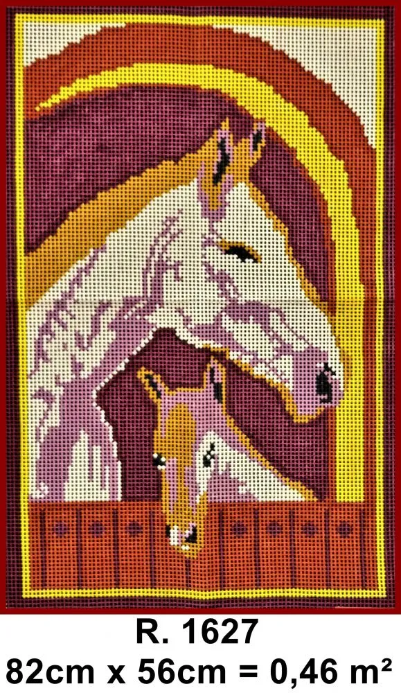 Tela talagarça pintada à mão, com pontos contados ímpares. Quadro, Animais, Égua e Potro