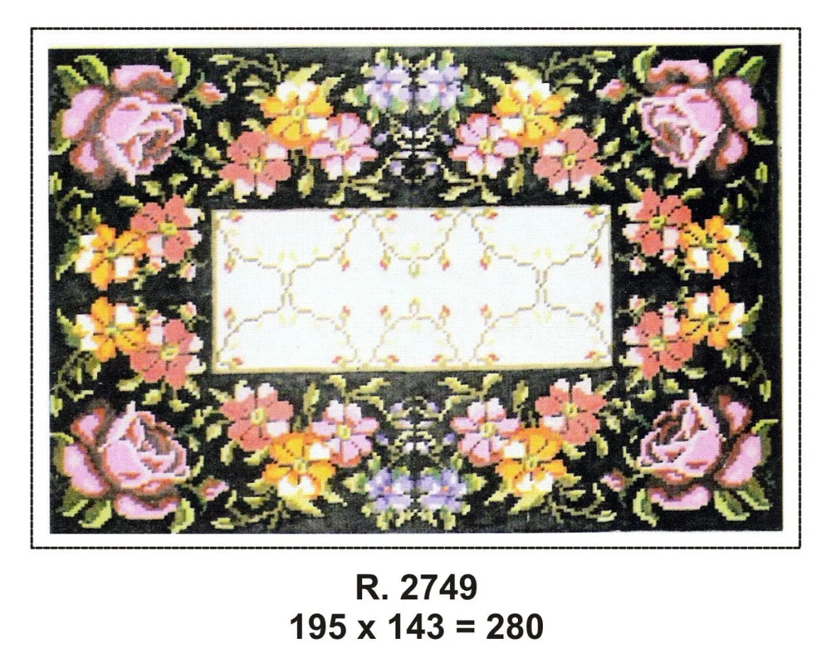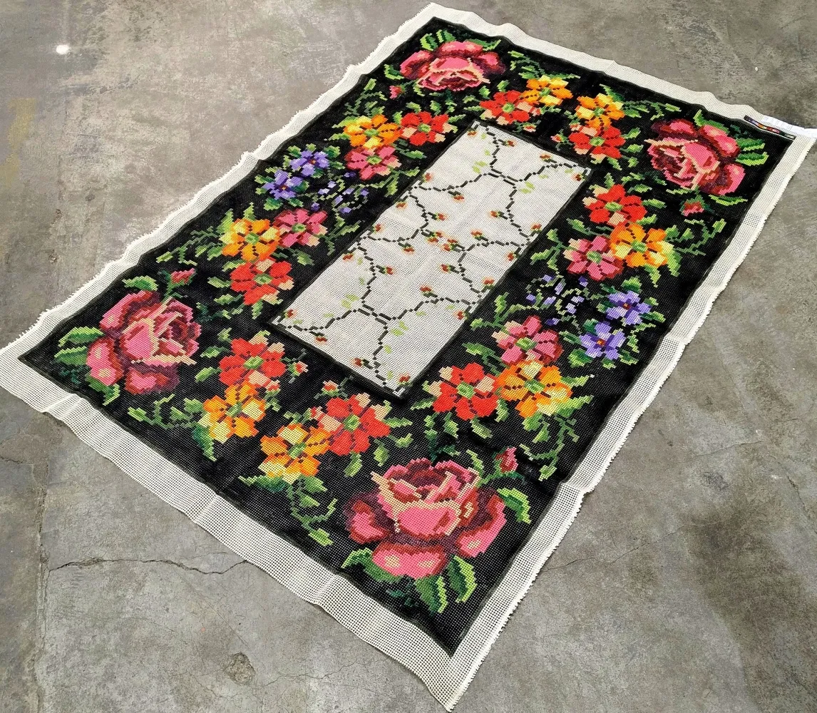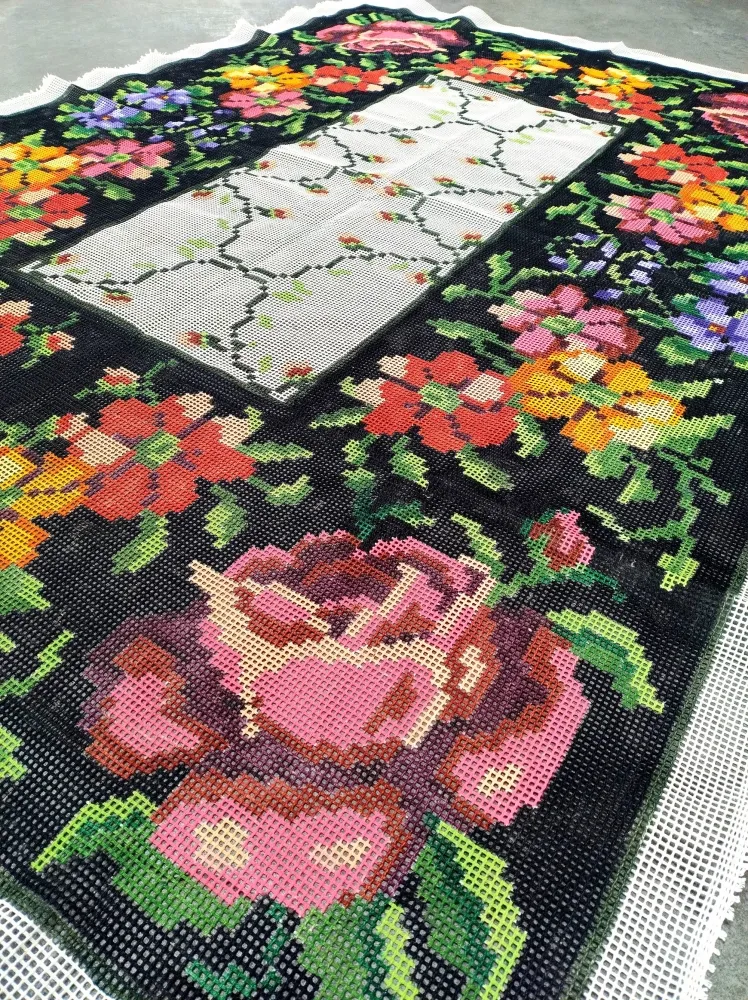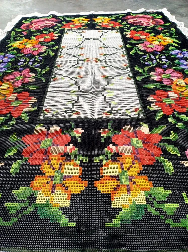 Tela talagarça pintada à mão, com pontos contados pares. Tapete, Floral.