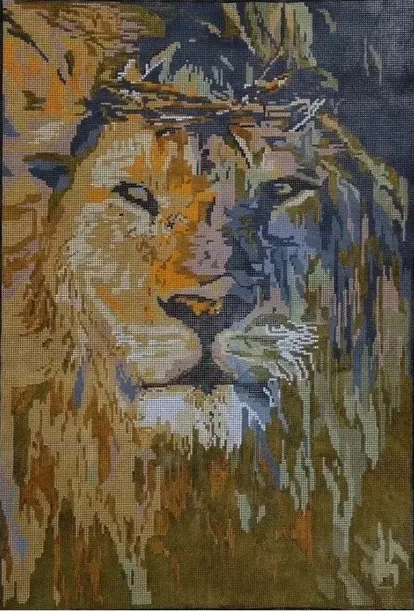 Tela talagarça pintada à mão, com pontos contados ímpares. Quadro, Leão com Coroa de Espinhos.