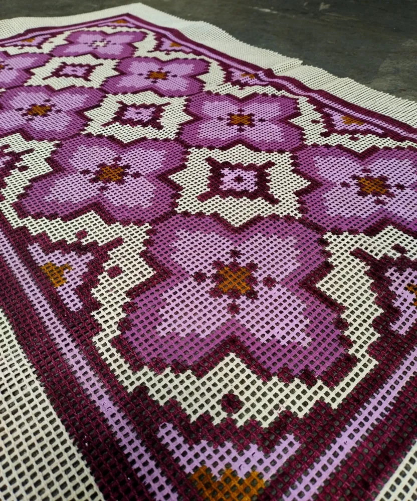 Tela talagarça pintada à mão, com pontos contados pares. Tapete, Geométrico.