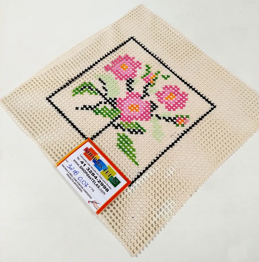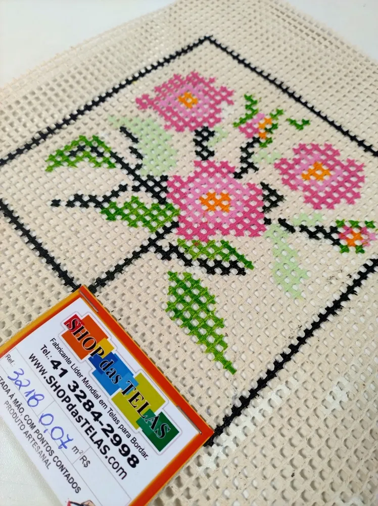 Tela talagarça pintada à mão, com pontos contados ímpares. Flor, Flotal, Rosa.